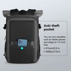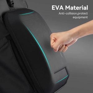 The backpack features a specialized camera compartment made of EVA material, providing shockproof and anti-collision protection to safeguard your camera and lenses. This compartment can hold one camera along with five short lenses or two long lenses, making it suitable for various DSLR and mirrorless camera systems. The top pocket includes a “one press to open” magnetic closure and a YKK zipper to ensure easy access and secure storage.