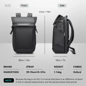 The Mark Ryden Model 2966 Backpack blends fashion and functionality with its high-capacity design and modern features. With a base capacity of 25 liters that expands to 36 liters, it provides ample space for daily essentials and travel gear. Measuring 47 x 30 x 18 cm and weighing 1.14 kg, the backpack combines a roomy interior with a lightweight build.