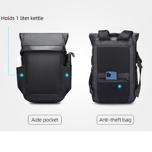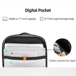 Constructed from durable Oxford fabric, the backpack features a digital pocket designed to fit a 17-inch laptop and a 9.7-inch tablet, both protected by a cotton layer. The organization system includes a main compartment, side pocket, wet and dry separation bag, and an anti-theft pocket for secure storage of valuables.