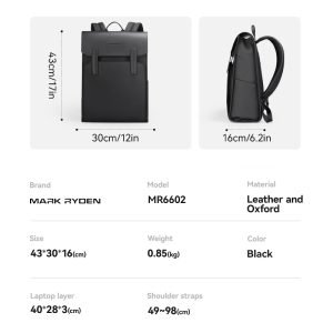 The Mark Ryden Model 6602 Backpack seamlessly combines style and functionality with its leather and Oxford material construction. Measuring 43 x 30 x 16 cm and weighing just 0.85 kg, this backpack offers a sleek yet practical solution for daily use.