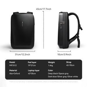 The Mark Ryden Model 7612 Anti-Theft Backpack is designed for modern travelers who prioritize security and organization. Constructed from a combination of ABS and Oxford fabric, this backpack measures 45 x 31 x 10 cm and weighs 1.4 kg, providing a durable yet lightweight option for carrying your essentials.
