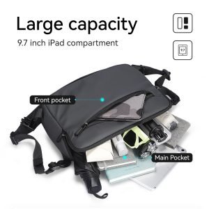 Measuring 30 x 20 x 9 cm and weighing just 0.42 kg, the bag features a large-capacity main pocket and five secondary pockets, including compartments for cards, a camera, a power bank, a sunscreen, a cigarette case, a pencil case, and a key hook. It can comfortably fit an 11″ iPad Pro, providing ample storage for your essentials.