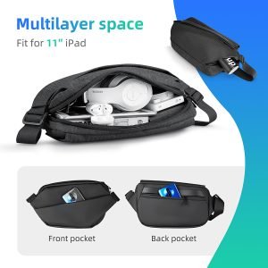 The bag features a well-organized internal structure, including a front flip zipper pocket, a main compartment, a back anti-theft pocket, and a middle hidden storage layer. This multi-layered design ensures convenient and practical storage for all your essentials, including an 11″ iPad.
