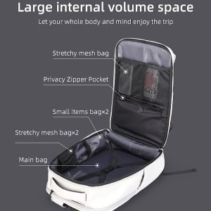 This backpack offers ample storage with its large internal volume, accommodating a 17.3-inch laptop and a 12.9-inch tablet. It features multiple pockets for organized storage, including a front sorting pocket, privacy zipper pocket, two small items bags, two stretchy mesh bags, and a side water bottle pocket for quick access to your kettle.