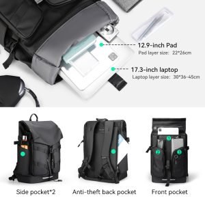 It features a magnetic closure design for secure and easy access, enhancing convenience during daily commutes. The backpack’s large capacity allows for organized storage with a professional system that includes dedicated compartments for a 17.3-inch laptop and a 12.9-inch pad. Additionally, it has multiple pockets including zip pockets, side pockets, and an anti-theft back pocket.