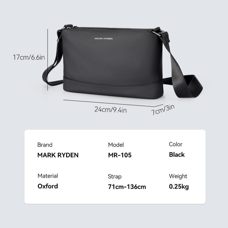 Crafted from durable Oxford fabric with water-repellent properties, the MR-105 is built to withstand the demands of daily city life. The adjustable shoulder strap (71–136cm) allows for a tailored, ergonomic fit whether you wear it on your chest or back. Premium YKK zippers and glossy hardware add a polished finish to the bag’s minimalist design.